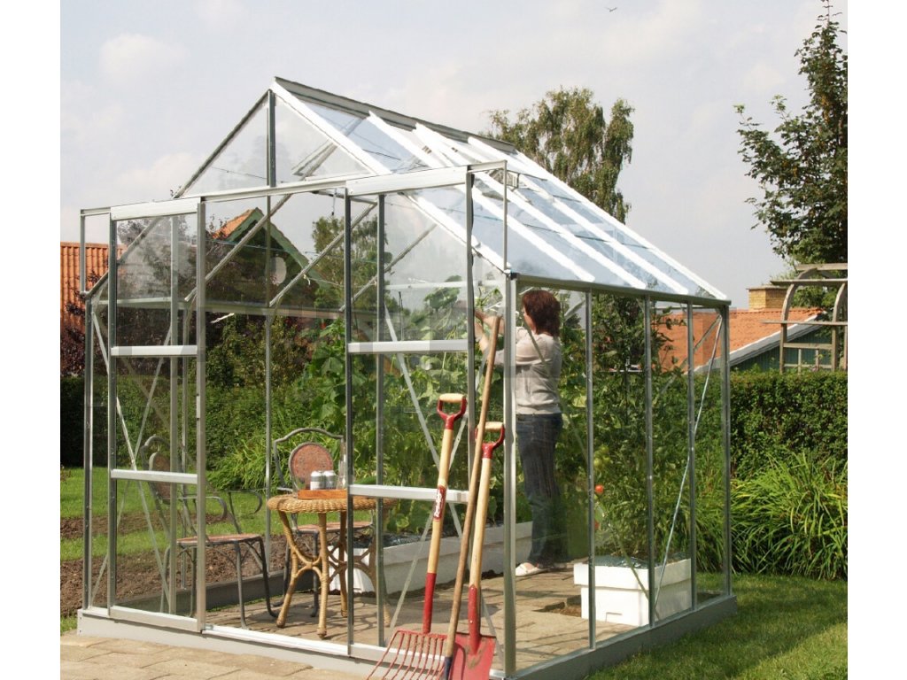 Konštrukcia skleníka je vyrobená z kvalitných eloxovaných hliníkových profilov 1,2 mm, pri ktorých poskytuje výrobca zmluvnú záruku 15 rokov na AL konštrukciu. Presklenie je z kaleného číreho skla hrúbky 3 mm. Číre sklo zaisťuje výbornú svetelnú priepustnosť, takže do skleníka je krásne vidieť zo všetkých strán a môžete sa kochať farbami pestovaných rastlín. Kalená verzia skla naviac zaisťuje jeho úplnú bezpečnosť - v prípade rozbitia sa sklenená výplň roztriešti na tisíce malých kúskov, čo zabráni prípadnému vážnemu zraneniu. To je veľmi dôležitá vlastnosť skleníka, ktorú ocenia predovšetkým rodičia malých detí pobehujúcich po záhrade. Presklenie je do hliníkových profilov kotvené pomocou oceľových sponiek. Pokiaľ by vás tento skleník zaujal, a skôr by ste uvítali polykarbonátové výplne, pozrite sa na varianty s polykarbonátom.