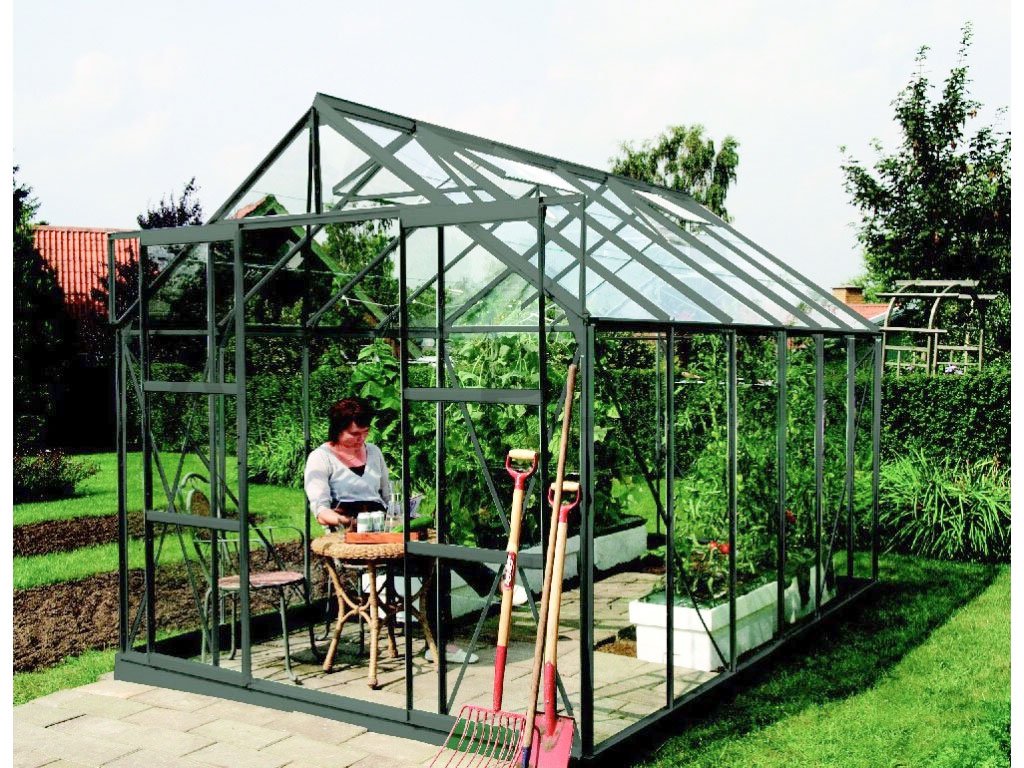 Konštrukcia skleníka je vyrobená z kvalitných eloxovaných hliníkových profilov 1,2 mm, pri ktorých poskytuje výrobca zmluvnú záruku 15 rokov na AL konštrukciu. Presklenie je z kaleného číreho skla hrúbky 3 mm. Číre sklo zaisťuje výbornú svetelnú priepustnosť, takže do skleníka je krásne vidieť zo všetkých strán a môžete sa kochať farbami pestovaných rastlín. Kalená verzia skla naviac zaisťuje jeho naprostú bezpečnosť - v prípade rozbitia sa sklenená výplň roztriešti na tisíce malých kúskov, čo zabráni prípadnému vážnemu zraneniu. To je veľmi dôležitá vlastnosť skleníka, ktorú ocenia predovšetkým rodičia malých detí pobehujúcich po záhrade. Presklenie je do hliníkových profilov kotvené pomocou oceľových sponiek. Pokiaľ by vás tento skleník zaujal, a skôr by ste uvítali polykarbonátové výplne, pozrite sa na varianty s polykarbonátom tu.