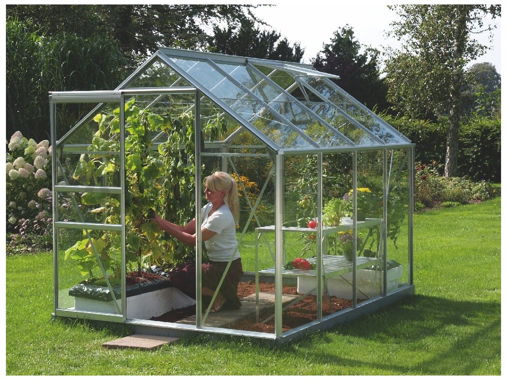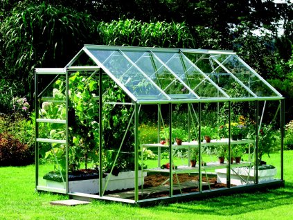 Konštrukcia skleníka je vyrobená z kvalitných eloxovaných hliníkových profilov 1,2 mm, pri ktorých poskytuje výrobca zmluvnú záruku 15 rokov na AL konštrukciu. Presklenie je z kaleného číreho skla hrúbky 3 mm. Číre sklo zaisťuje výbornú svetelnú priepustnosť, takže do skleníka je krásne vidieť zo všetkých strán a môžete sa kochať farbami pestovaných rastlín. Kalená verzia skla naviac zaisťuje jeho úplnú bezpečnosť - v prípade rozbitia sa sklenená výplň roztriešti na tisíce malých kúskov, čo zabráni prípadnému vážnemu zraneniu. To je veľmi dôležitá vlastnosť skleníka, ktorú ocenia predovšetkým rodičia malých detí pobehujúcich po záhrade. Presklenie je do hliníkových profilov kotvené pomocou oceľových sponiek. Pokiaľ by vás tento skleník zaujal, a skôr by ste uvítali polykarbonátové výplne, pozrite sa na varianty s polykarbonátom.
