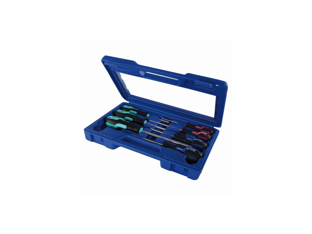 Sada krížových skrutkovačov PROFI PHILLIPS určená na montáž a opravy v náročných podmienkach. Čepeľ je z ušľachtilej vysoko legovanej ocele, povrch je chrómovaný. Pracovná časť je začiernená. Skrutkovače majú ergonomickú rukoväť s šesťhranným prierezom, odolnú proti oleju aj benzínu. Tvar rukoväte bráni samovoľnému pohybu pri odložení. Skrutkovače sú uložené v praktickom prenosnom kufríku.