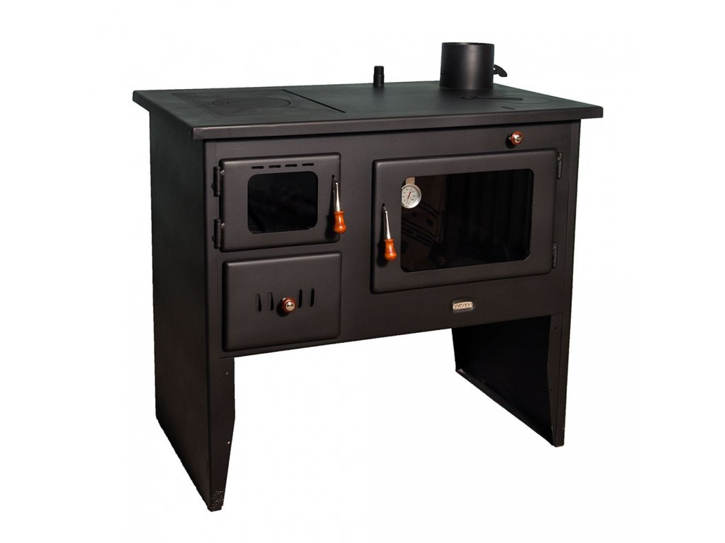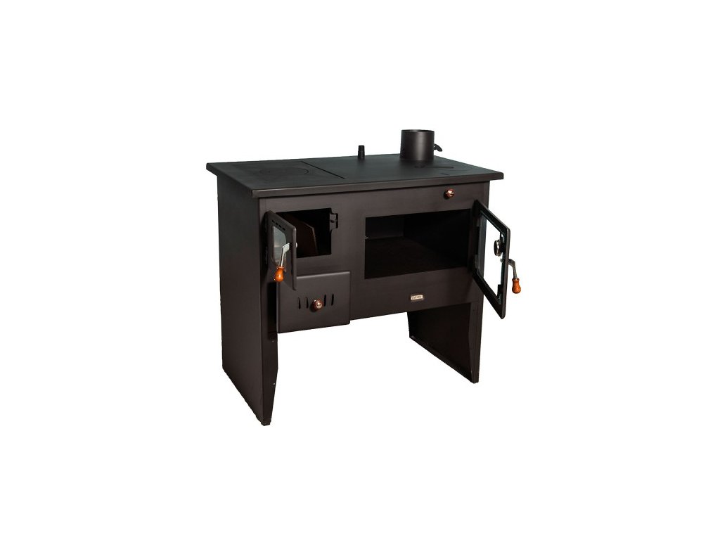 Kuchynský sporák má vpravo umiestnenú presklenú rúru na pečenie s teplomerom. V hornej časti sú dve varné liatinové platničky. V spodnej časti kachlí nájdete praktický priestor na skladovanie dreva. Kachle sú z kvalitného oceľového plechu. Sú lakované špeciálnym žiaruvzdorným lakom, ktorý odoláva vysokým teplotám. Kľučky a regulátory sú vyrobené z mosadze alebo sú poniklované, úchyty sú drevené. Priemer dymovodu je 130 cm. Vývod dymovodu je horný a na výstupe zo sporáka je pridaná dymová klapka na reguláciu spalín. Vnútro ohniska je vyložené šamotom a vybavené liatinovým roštom. Primárnou vzduchovou klapkou umiestnenou na dvierkach popolníka ovládate prívod vzduchu do kachlí, sekundárny vzduch oplachuje sklo a nemožno ho regulovať. Súčasťou týchto krbových kachlí je teplovodný výmenník. Teplovodný výmenník slúži na možnosť pripojenia vykurovacích telies alebo zásobníkového ohrievača vody. Menovitý výkon kachlí 12 kW do vody a 4 kW do vzduchu vám pomôže vykúriť priestor s objemom až 230 m3.