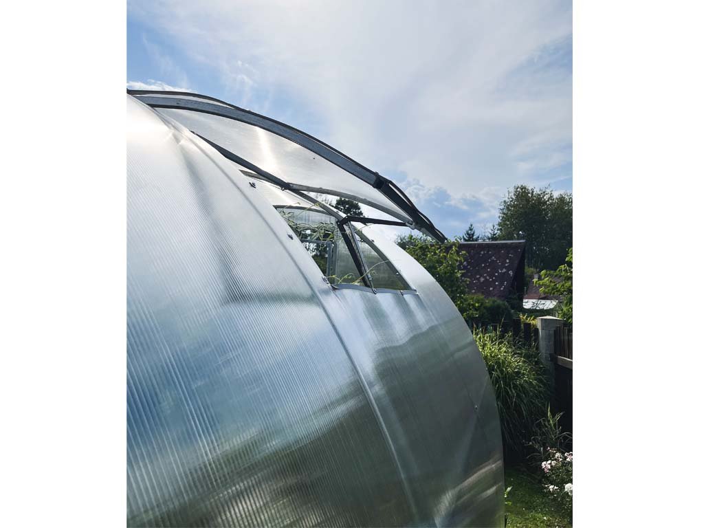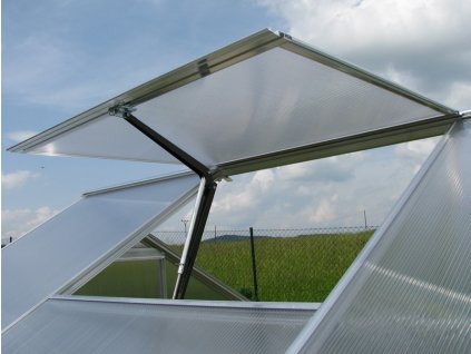 Strešné okno pre všetky modely záhradných polykarbonátových skleníkov LEGI dokonale vyvetrá váš skleník. Teplý vzduch sa v priestore, teda aj v skleníku, drží pri strope, a tak je práve strešná ventilácia úplne zásadná. Čelnú ventiláciu skleníka (čelné okná alebo dvere) možno označiť skôr ako doplnkovú.