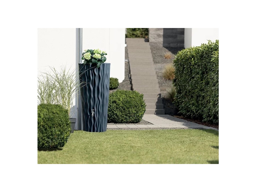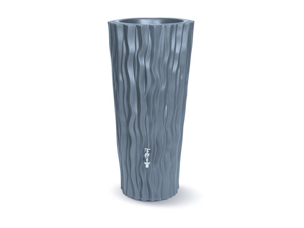 Moderná nádrž na dažďovú vodu Alana v tvare vázy s jedinečnou povrchovou úpravou je vyrobená z kvalitného plastu, ktorý je odolný voči poveternostným vplyvom. Najväčšou prednosťou tejto nádrže na vodu je jej elegantné prevedenie, použité kvalitné materiály a predovšetkým jej praktickosť. Nádrž je vo svojej spodnej časti vybavená dvoma otvormi s 3/4" mosadzným závitom pre výpust vody. Jeden je určený pre napojenie kohútika ITAP, ten kúsok od zeme potom na napojenie hadice na vodu, alebo pre úplné vypustenie nádrže, alebo prepojenie viacerých nádrží. Konštrukčne je tento typ suda tzv. fúkaný, aby bol na rovnom povrchu dobre stabilný a teda nie je potreba podstavca. V hornej časti má trvalo integrovanú výsadbovú komoru, do ktorej môžete zasadiť kvety podľa ročného obdobia a vytvoriť tak z nádoby záhon.
