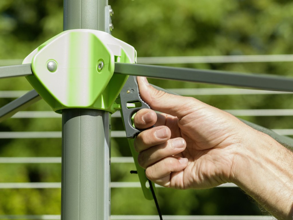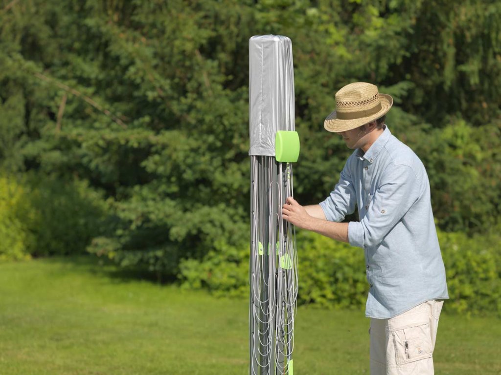 Montáž sušiaku Juwel je úplne jednoduchá a nie je potrebné nič betónovať. Ukotvenie do zeme je riešené pomocou plastovej zemnej skrutky, ktorá sa zaskrutkuje do zeme a do nej sa zasunie nosná tyč. Veľkou výhodou zemnej skrutky je, že sušiak môžete umiestniť kdekoľvek na záhrade, kde je možné skrutku zavŕtať pevne do zeme.