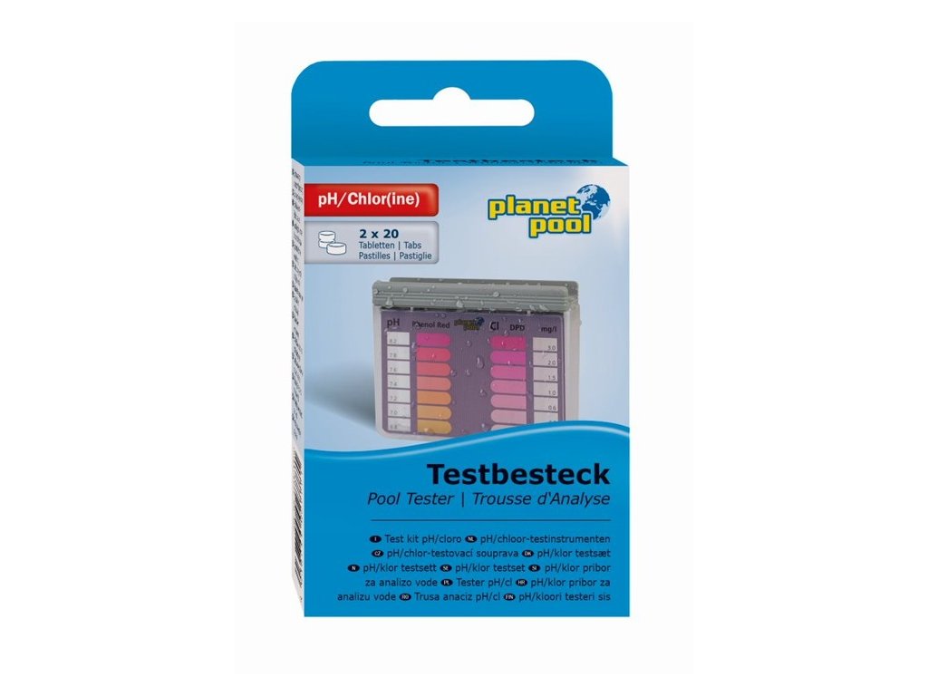 Pomocou tejto testovacej sady rýchlo a ľahko určíte hodnotu pH a koncentrácie voľného chlóru v bazénovej vode. Použite tablety Phenol Red na stanovenie hodnoty pH a tablety DPD1 na stanovenie hodnoty koncentrácie voľného chlóru. Súprava obsahuje 20 tabliet Phenol Red, 20 tabliet DPD1 a tester (odmerka so stupnicou).