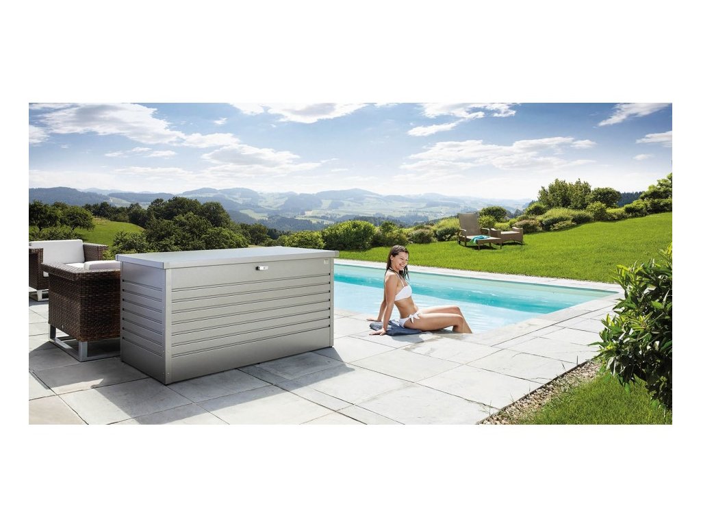 Štýlový úložný box FreizeitBox prémiovej kvality, ktorý vyhovuje aj nárokom modernej architektúry je ideálny na uloženie sedákov, lehátok, skladacích stoličiek, hračiek, športových a kempingových doplnkov. Box je široký 160 cm a 79 cm hlboký. Úložné boxy FreizeitBox ponúkame v piatich farebných prevedeniach a štyroch veľkostiach. Vďaka tomu sa môže stať FreizetBox aj dizajnovým prvkom na vašej záhrade, terase, pri bazéne alebo v pergole.