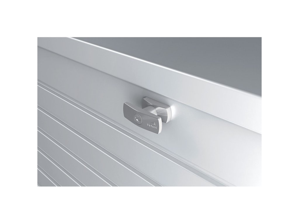 Štýlový oceľový úložný box FREIZEITBOX® 180, v prémiovej kvalite, v prevedení biela metalíza s otváracím horným vekom. Vonkajšie rozmery 181 x 79 cm. Atraktívny design, bezpečnosť, doživotná bezúdržbovosť. Kvalita so zárukou 20 rokov.