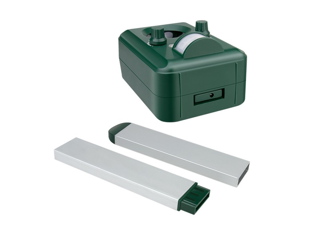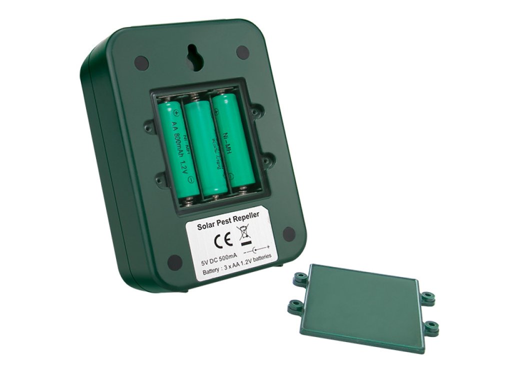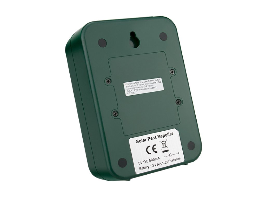 Odpudzovač môžete používať v bytoch, domoch, garážach, podkroviach, pivniciach, reštauráciách aj vo vonkajších priestoroch, ako sú záhrady, dvory, sady, parkoviská. Vodotesné telo chráni zariadenie pred slnkom, dažďom, vetrom aj mrazom. Stačí ho zapichnúť do zeme pomocou priloženého kolíka alebo zavesiť na stenu vďaka otvorom na zadnej strane. Zariadenie obsahuje 3× nabíjacie batérie AA, ktoré sa nabíjajú solárnym panelom alebo USB káblom – obe možnosti sú súčasťou balenia.