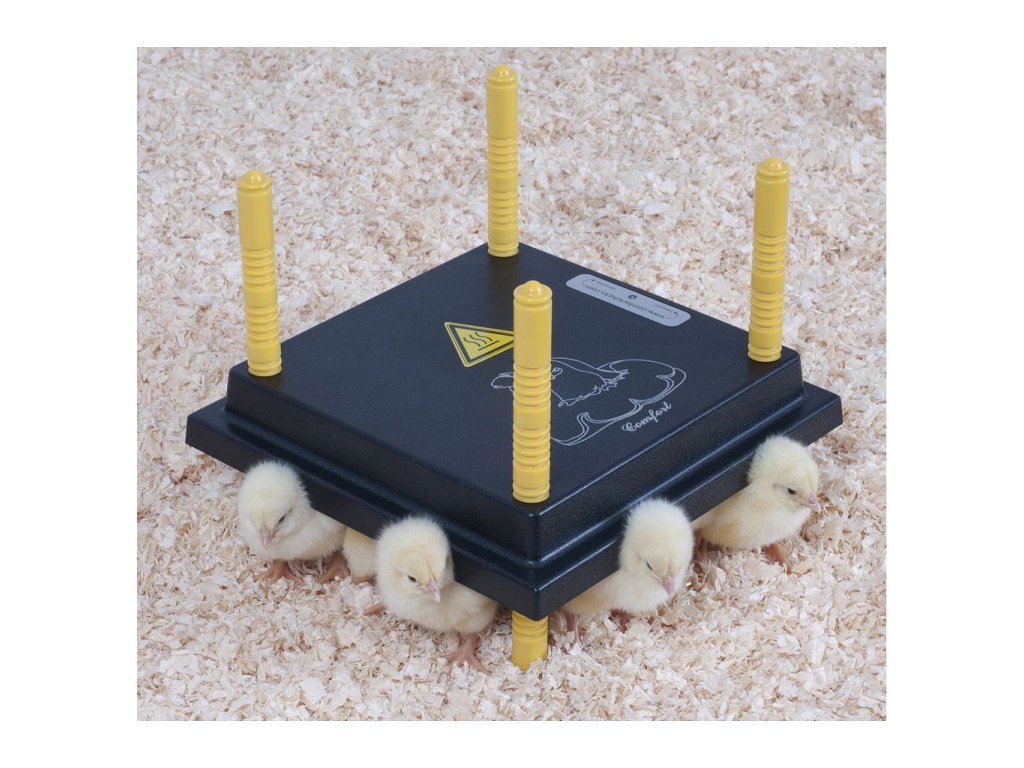 Umelá kvočka – 25x25 cm výhrevná doska na pohodlné umiestnenie hydiny po vyliahnutí. Teplotu je možné regulovať pomocou žltých nastaviteľných nožičiek. Ako doplnok je možné dokúpiť aj regulátor výkonu.