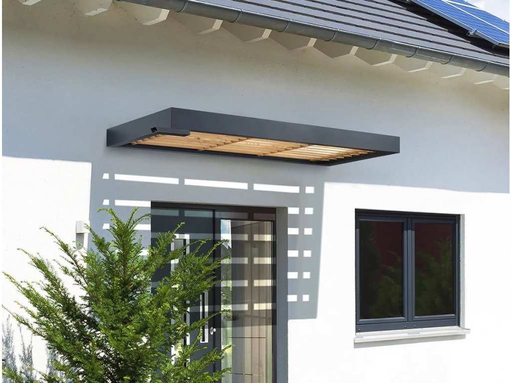 Rovná strieška nad vchodové dvere nemeckej výroby Guttavordach BS Timber-Line s rozmermi 160 × 90 cm predstavuje ideálne a veľmi elegantné spojenie troch rôznych materiálov – hliníka, dreva a skla. Skrášlia priestor vstupu do vášho domu a súčasne je dokonalou ochranou vašich dverí pred dažďom, snehom a vetrom. Je vhodná na zastrešenie vchodov, balkónov, výkladov obchodov, alebo napríklad na zastrešenie nad bankomatmi.