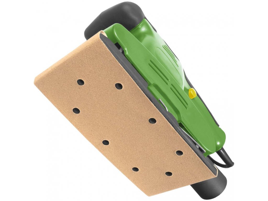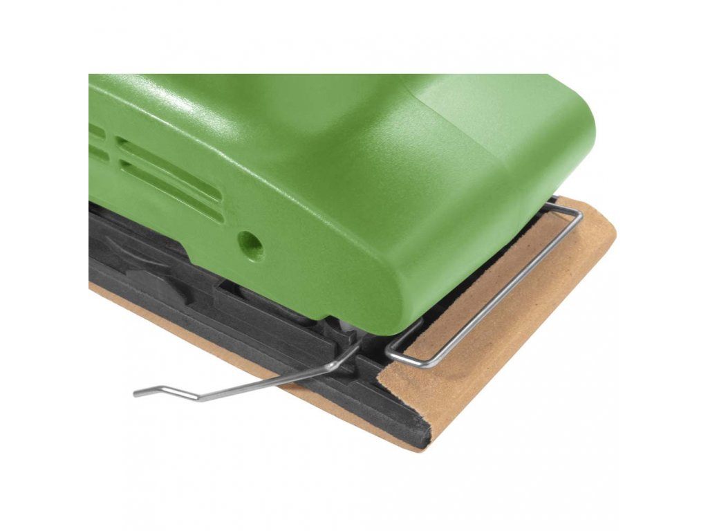 Výmena brúsneho papiera je veľmi jednoduchá, stačí odopnúť dve úchytné spony umiestnené na protiľahlých stranách vibračnej plochy. Pre komfortnejšiu manipuláciu poslúži aretácia spínacieho tlačidla. K brúske je možné pripojiť vysávač pre väčšiu elimináciu prachu v priestore brúsenia. Hladina akustického výkonu je len 87 decibelov.