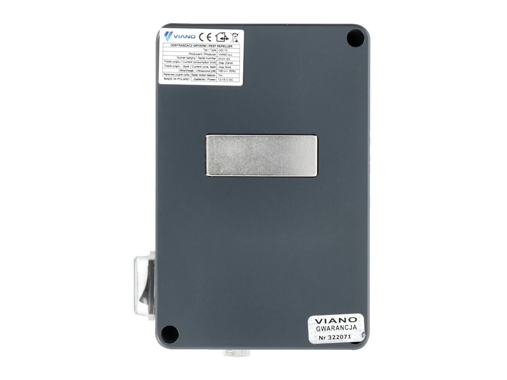 Výkonný ultrazvukový odpudzovač VIANO OD15 LED s napájaním cez 12V adaptér efektívne odpudzuje kune, myši, potkany a iné hlodavce. Pokryje plochu až 2500 m², disponuje 2 piezo reproduktormi a navyše 3 stroboskopickými LED svetlami, ktoré sa spúšťajú pri pohybe. Vďaka modulácii frekvencie si škodce na zvuk nezvyknú. Vodotesný kryt IP65 umožňuje použitie v interiéri aj exteriéri. Odpudzovač ľahko upevníte vďaka magnetickému držiaku.