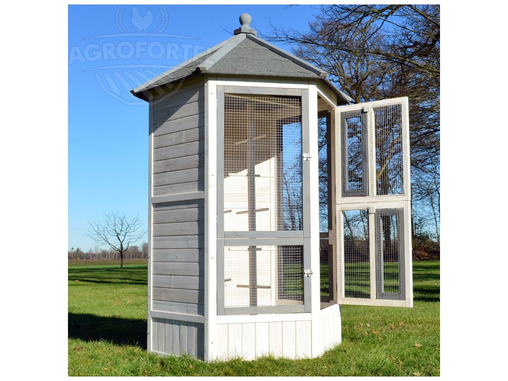 Údržba a čistenie voliéry sú vďaka štyrom dverám veľmi jednoduché. Tieto dvere umožňujú rýchly prístup do vnútra voliéry, čo uľahčuje kŕmenie vtákov a čistenie ich priestoru. Praktické rozmiestnenie dverí zabezpečuje, že každá časť voliéry je ľahko dostupná.