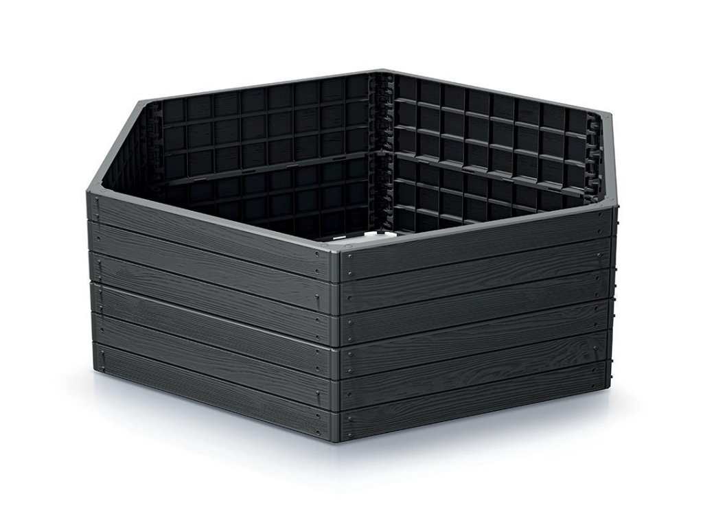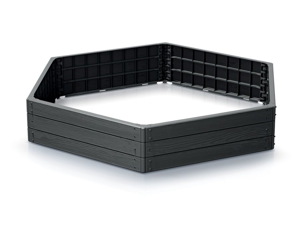 Skladací vyvýšený záhon v tvare šesťuholníku šetrí vaše kolená, vďaka pevnému ohraničeniu zeminy v záhone zostáva na svojom mieste, a zároveň pomocou vrstvenia rôznych materiálov dosahuje pôda vyššie teploty. Možnosť dvojakého využitia vďaka jednotlivým panelom.