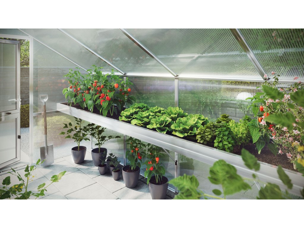 Praktický podnos na rostliny KGT je vyrobený z vysoce kvalitního hliníku a vede podél celé boční steny skleníku. Vysoce odolné plastové vložky možno jednotlive vyjmout a ľahko vyčistit. Vďaka inteligentnímu upevnenie k skleníku vydrží všechny nosné komponenty vysoké zatížení. Hloubka podnosu je približne 63,5 cm. Podnos na rostliny má tiež okr