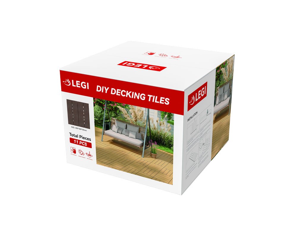 WPC dlaždice LEGI Base vo farbe tmavohnedá sú súčasťou komplexného podlahového systému LEGI a je vhodné ich použiť ako exteriérovú podlahovú krytinu. Majú veľmi jednoduchú a rýchlu montáž aj demontáž. Rozmer dlaždice Base je 2,0 x 30 x 30 cm.
