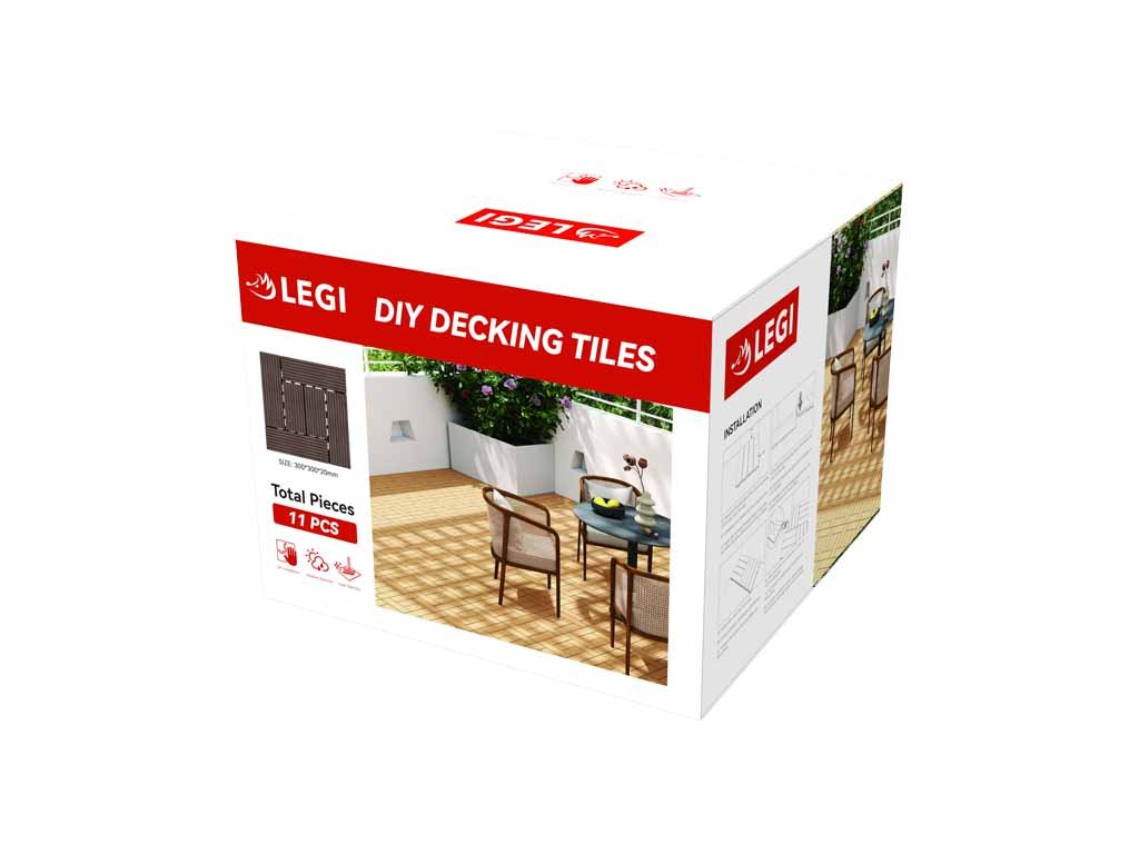 WPC dlaždice LEGI Style vo farbe tmavohnedá sú súčasťou komplexného podlahového systému LEGI a je vhodné ich použiť ako exteriérovú podlahovú krytinu. Majú veľmi jednoduchú a rýchlu montáž aj demontáž. Rozmer dlaždice Style je 2,0 x 30 x 30 cm.