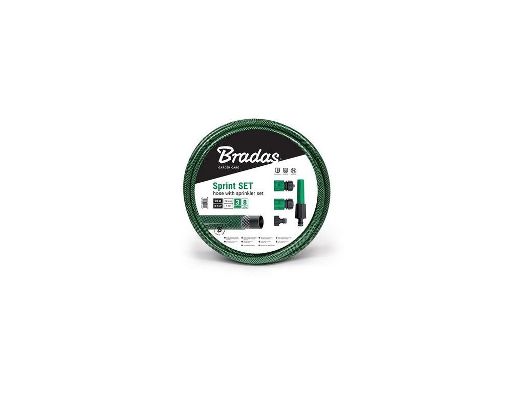 Kvalitná trojvrstvová záhradná hadica BRADAS SPRINT priemer 1/2", dĺžka 20 m, zelená, vystužená pletenou krížovou textilnou výstužou. Dodávame vrátane príslušenstva.