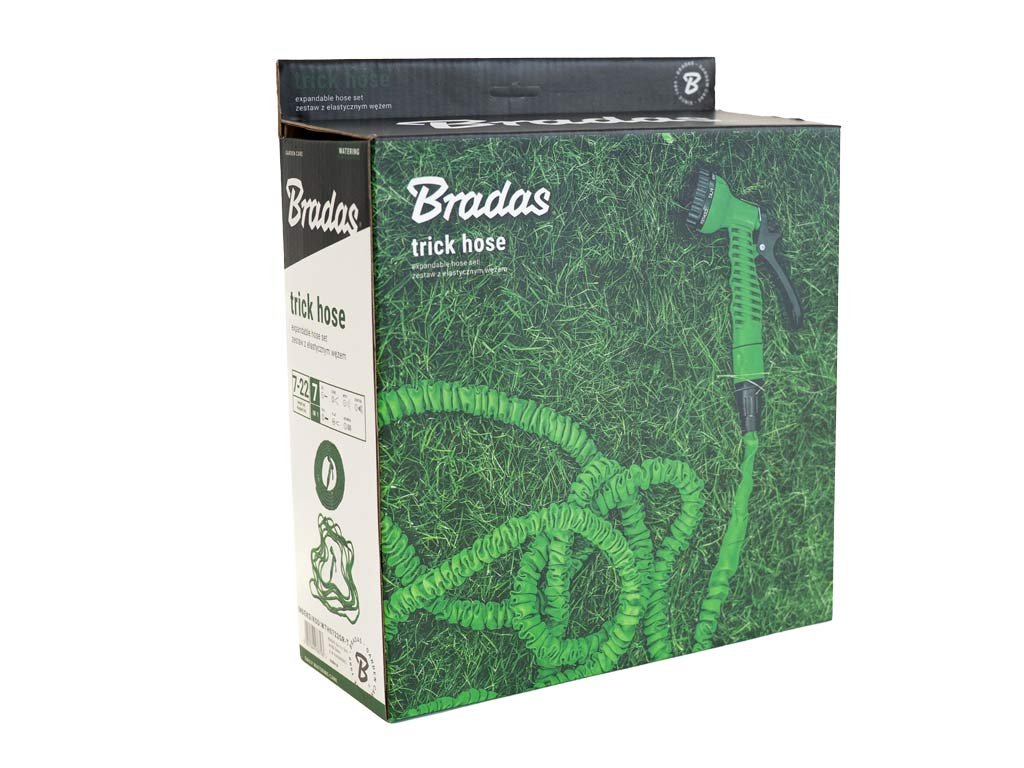 Hadica Bradas TRICK HOSE je vyrobená z vysoko kvalitných odolných materiálov. Vnútro hadice tvorí odolná a pružná gumová sieťovina, ktorá zároveň tvorí ochrannú vonkajšiu vrstvu. Pod vplyvom tlaku vody sa hadica až trojnásobne predĺži, čo uľahčuje polievanie a pohyb po záhrade. Po vypustení vody sa hadica automaticky stiahne do svojej pôvodnej veľkosti.