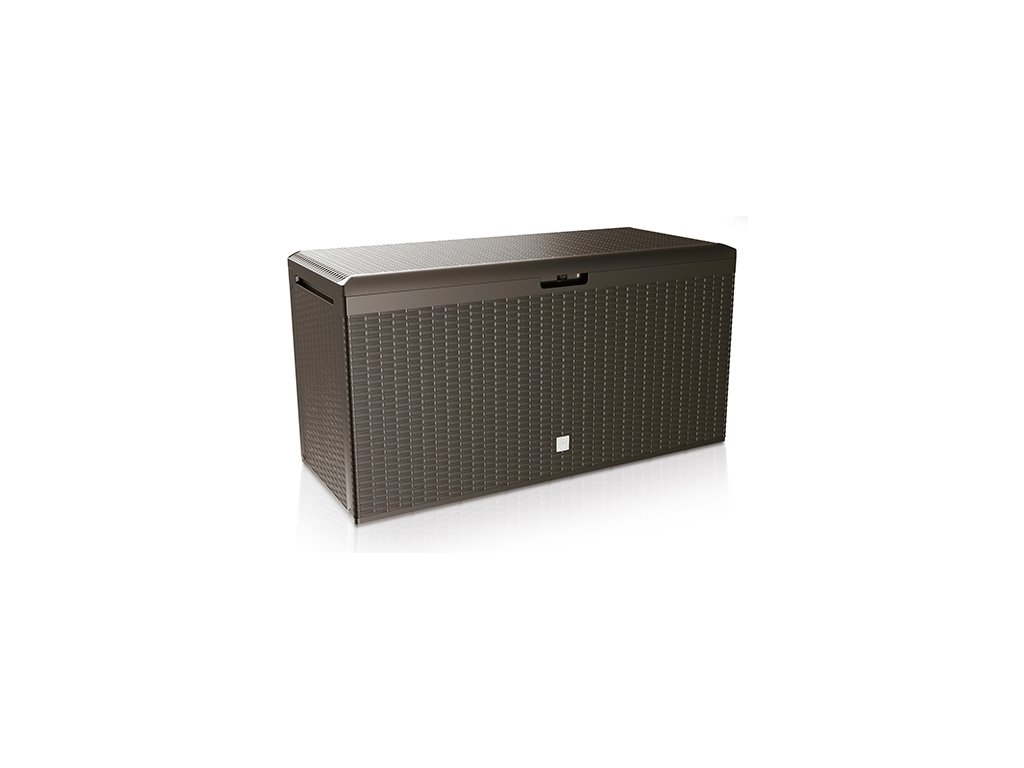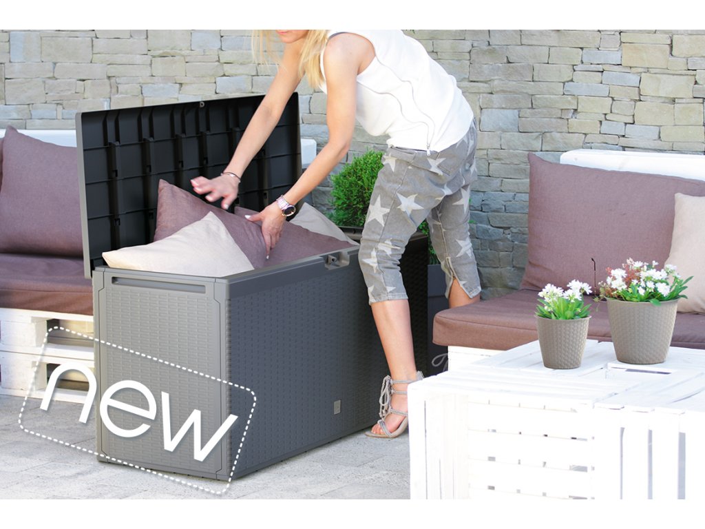 Box je ľahký, odvetraný a chráni uschované predmety pred prípadným dažďom. Ľahko v ňom uschováte vankúše zo záhradného nábytku, deky, záhradné potreby, menší nábytok alebo hračky pre deti. Vstavaný držiak s možnosťou uzamknutia vám dovolí zamknúť cennejšie veci vo vnútri. Bočné strany majú mozaikovú štruktúru a sú zdobené imitáciou ratanového výpletu.