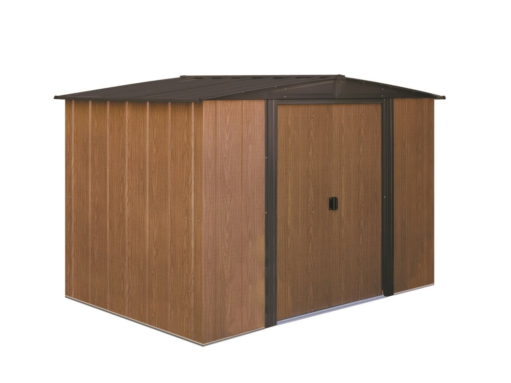 Záhradný domček na náradie ARROW WOODLAKE 86 v kombinácii farieb drevený dekór a hnedá sa hodí k celoročnému uskladneniu náradia, kosačiek, nábytku a ďalšieho záhradného vybavenia. Domček má rozmery 253 x 181 cm (predná strana s dvermi x hĺbka) a výšku stien 157 cm. Zastavaná plocha činí necelé 4,6 m2.