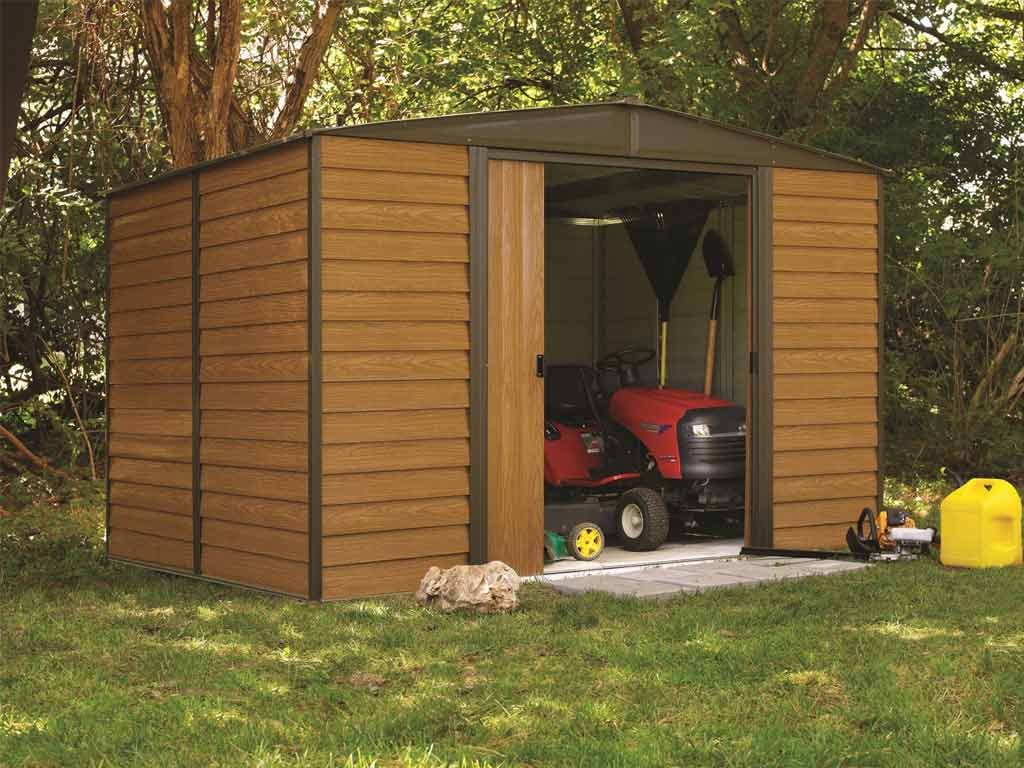Záhradný domček na náradie ARROW WOODRIDGE 108 v kombinácii farieb drevený dekór a hnedá sa hodí k celoročnému uskladneniu náradia, kosačiek, nábytku a ďalšieho záhradného vybavenia. Domček má rozmery 313 x 242 cm (predná strana s dvermi x hĺbka) a výšku stien 181 cm. Zastavaná plocha činí 7,6 m2.