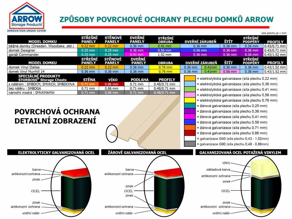 Steny záhradného domčeka sú vyrobené z kvalitného profilovaného oceľového plechu hrúbky 0,22 - 0,35 mm a konštrukcia z pozinkovaného plechu o hrúbke 0,36 - 0,40 mm. Strecha a časti podlahovej konštrukcie sú žiarovo pozinkované, steny a zbytok konštrukcie prešli elektrolytickým zinkovaním. Všetky nalakované diely sú opatrené kvalitnou polyesterovou farbou. Vďaka tomu je domček odolný voči nepriaznivému počasiu a je možné ho používať po celý rok. Aj preto výrobca poskytuje záruku 10 rokov proti prehrdzaveniu.
