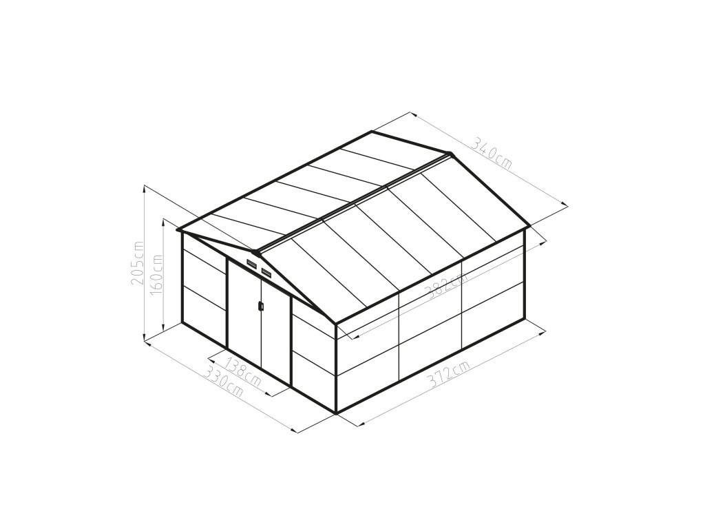 Rozmery domčeka umožňujú pohodlný prístup a manipuláciu s uloženým náradím. Celková šírka prednej strany činí 340 cm, výška v najvyššom bode je 205 cm a celková šírka bočnej strany je 382 cm. Výška steny bez strechy je 163 cm. Na prednej strane sa nachádzajú dvoje posuvné dvere.