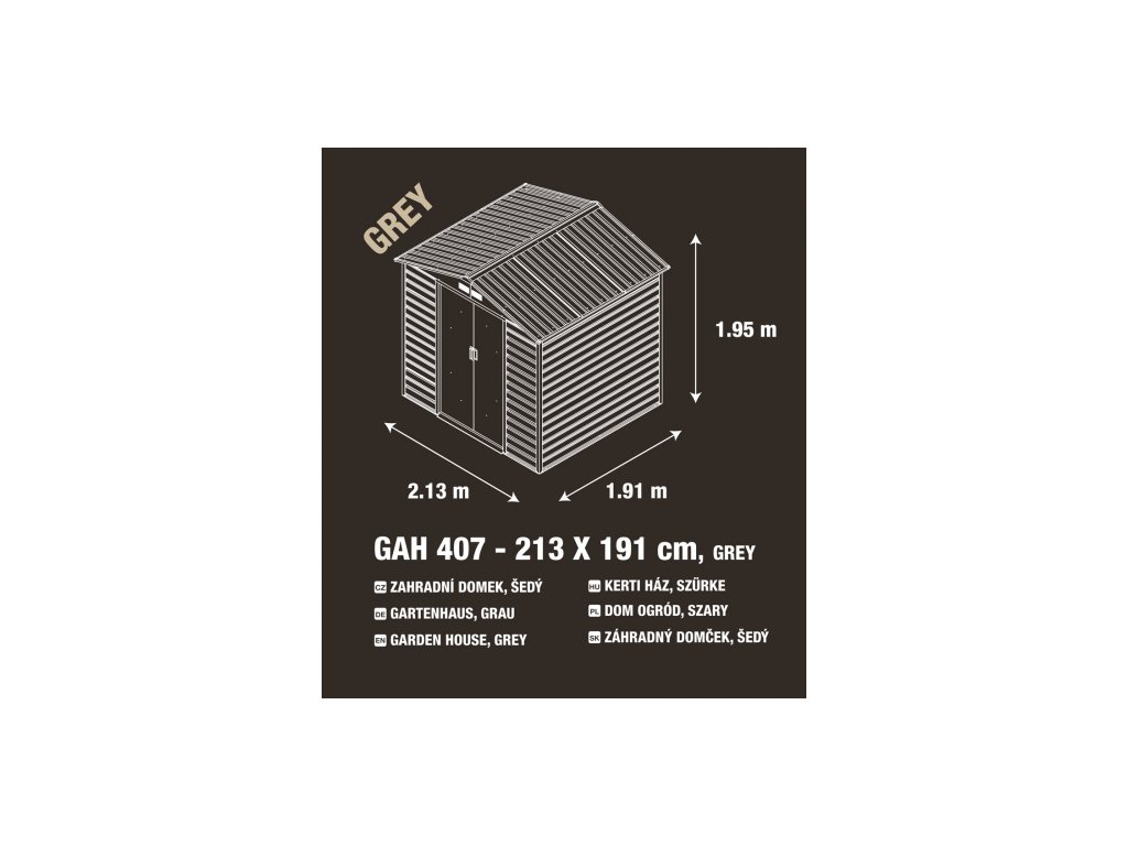 Rozmery domčeka umožňujú pohodlný prístup a manipuláciu s uloženým náradím. Celková šírka prednej strany činí 213 cm, výška v najvyššom bode je 190 cm a celková šírka bočnej strany je 191 cm. Výška steny bez strechy je 163 cm. Na prednej strane sa nachádzajú dvoje posuvné dvere.