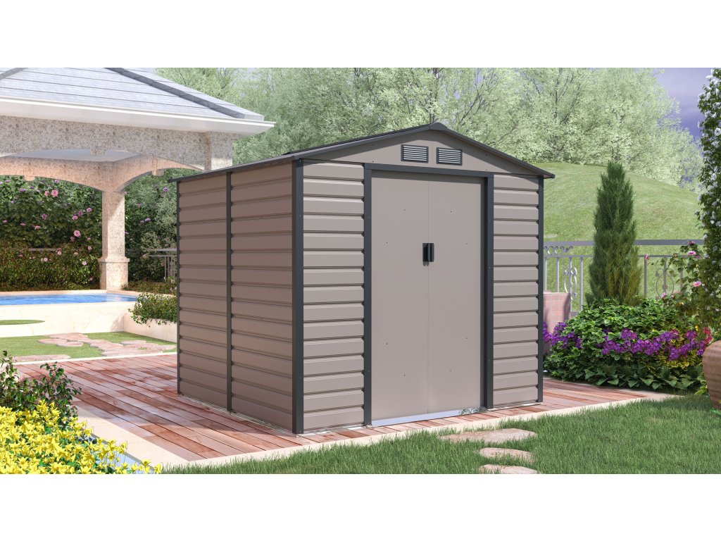 Záhradný domček na náradie v modernom designe má dvoje veľké posuvné dvere a vysoký vstupný otvor, takže budete mať do neho pohodlný prístup.