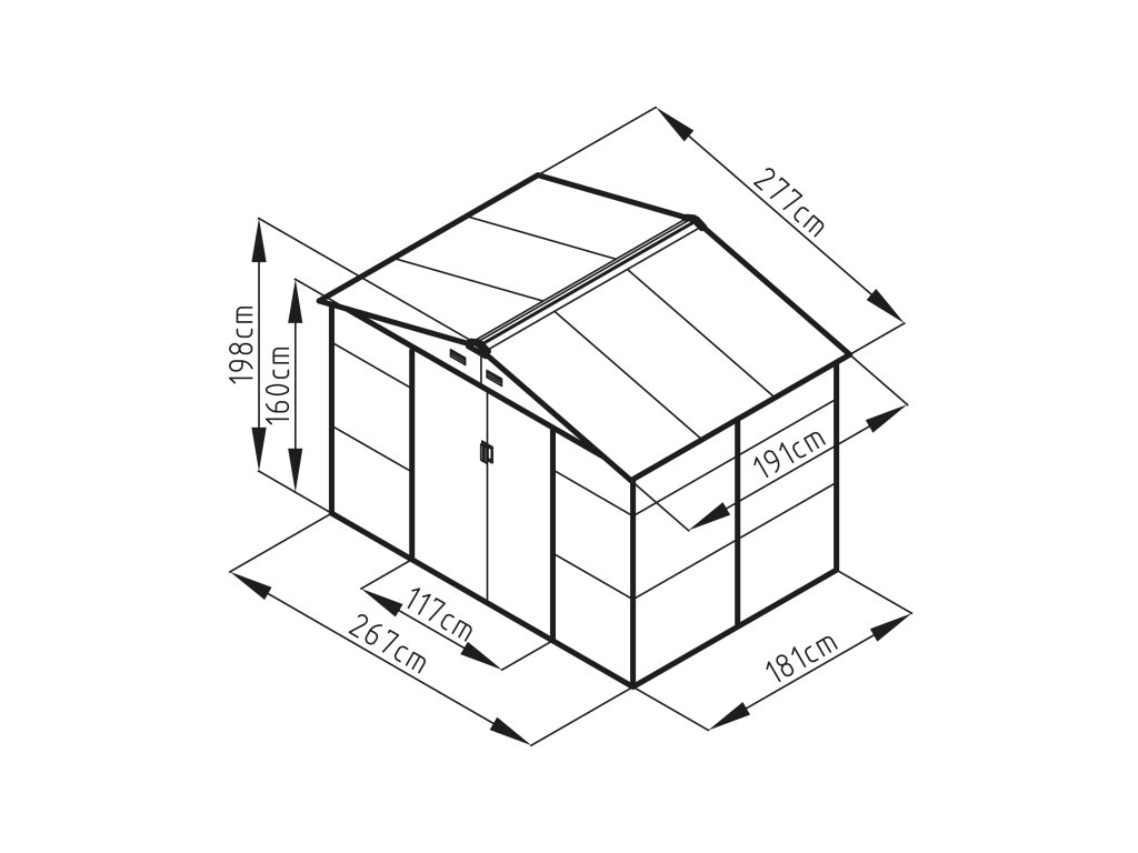 Rozmery domčeka umožňujú pohodlný prístup a manipuláciu s uloženým náradím. Celková šírka prednej strany činí 277 cm, výška v najvyššom bode je 198 cm a celková šírka bočnej strany je 255 cm. Výška steny bez strechy je 163 cm. Na prednej strane sa nachádzajú dvoje posuvné dvere.