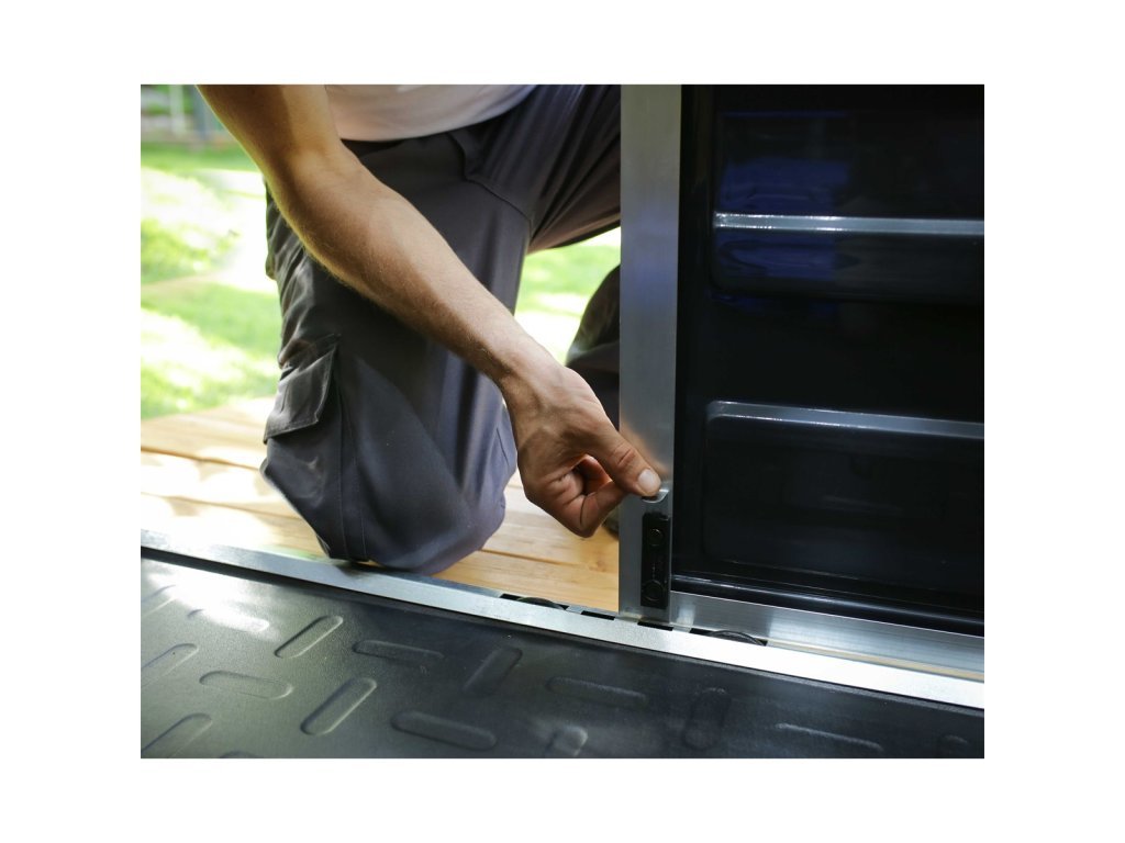 Dvere sú uzamykateľné, s hliníkovým rámom a zníženým prahom, čo umožňuje jednoduchý prístup a manipuláciu s fúrikom alebo kosačkou. Protišmyková podlaha, ktorá je súčasťou balenia, chráni uložené veci pred vlhkosťou a zabezpečuje bezpečný pohyb vo vnútri domčeka.
