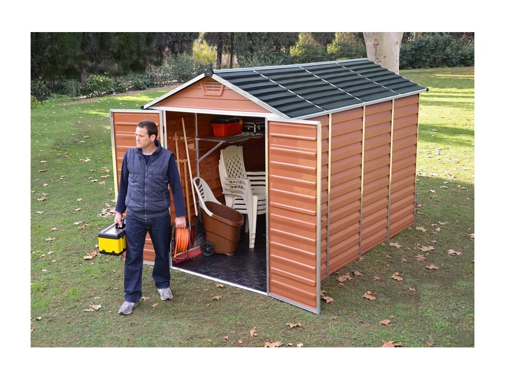 Zaobstarajte si špičkový záhradný domček PALRAM Skylight 6x10 v modernej hnedej farbe, ktorý ponúka bezpečné a elegantné riešenie na uskladnenie záhradného náradia, športového vybavenia, grilovacích potrieb alebo záhradného nábytku. Vďaka kvalitným materiálom a premyslenému dizajnu sa domček stane odolným a štýlovým doplnkom vašej záhrady. Záhradný domček je vďaka svojim vlastnostiam dokonalým riešením pre každého, kto hľadá štýlové, odolné a ľahko udržiavateľné úložné miesto.