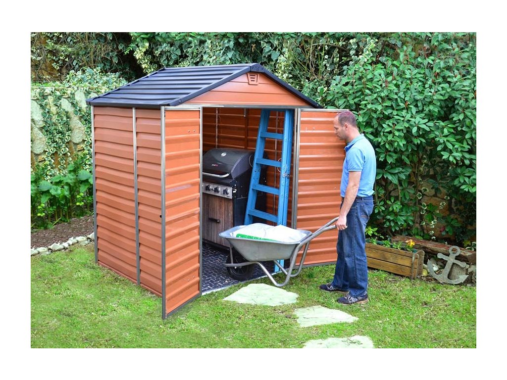 Zaobstarajte si špičkový záhradný domček PALRAM Skylight 6x5 v modernej hnedej farbe, ktorý ponúka bezpečné a elegantné riešenie na uskladnenie záhradného náradia, športového vybavenia, grilovacích potrieb alebo záhradného nábytku. Vďaka kvalitným materiálom a premyslenému dizajnu sa domček stane odolným a štýlovým doplnkom vašej záhrady. Záhradný domček je vďaka svojim vlastnostiam dokonalým riešením pre každého, kto hľadá štýlové, odolné a ľahko udržiavateľné úložné miesto.