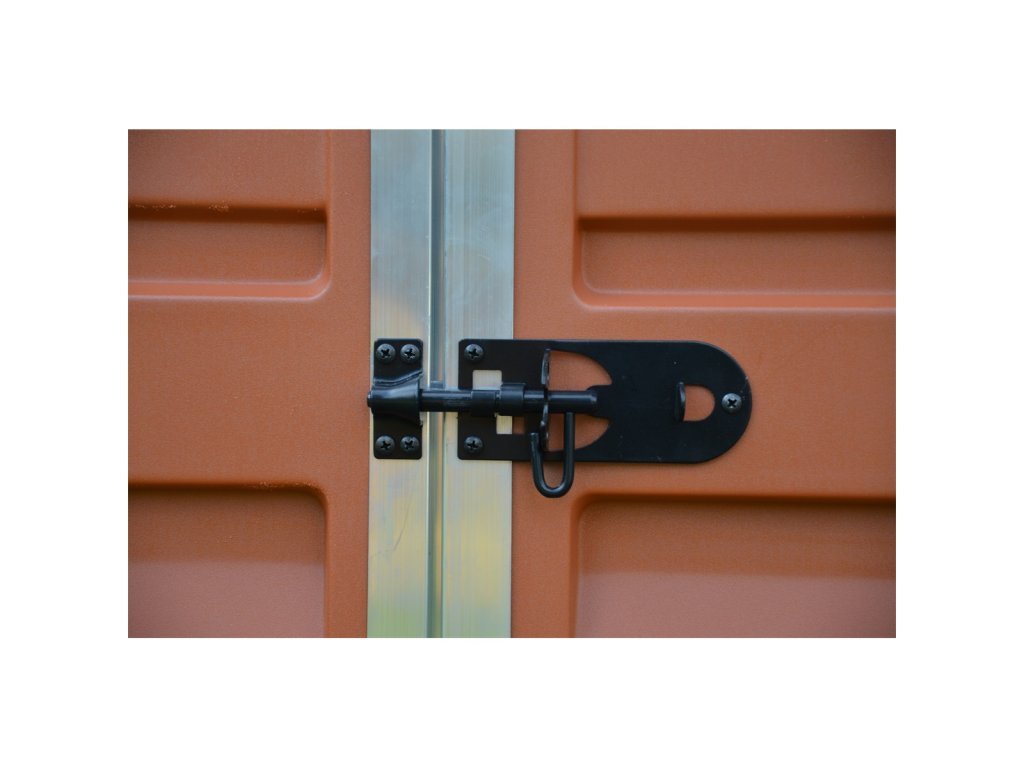 Dvere sú uzamykateľné, s hliníkovým rámom a zníženým prahom, čo umožňuje jednoduchý prístup a manipuláciu s fúrikom alebo kosačkou. Protišmyková podlaha, ktorá je súčasťou balenia, chráni uložené veci pred vlhkosťou a zabezpečuje bezpečný pohyb vo vnútri domčeka.