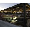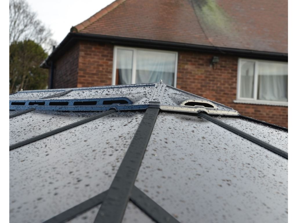 Integrovaný systém okapů skvěle odvádí vodu (O 40 mm). Integrovaný ventilační otvor podporuje proudění vzduchu a odvádí kouř při grilování. Integrovaný systém posuvných háčků pro možnost zavěšení závěsu nebo sítě proti hmyzu (lze dokoupit jako příslušenství).