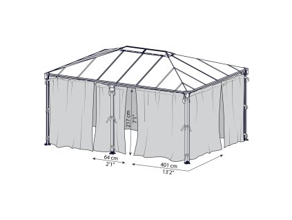 Rozměry pergoly jsou 492 x 359 x 285 cm (D x Š x V) a plocha altánu činí 13 m2. Altán má 6 opěrných sloupků a střecha je bronzové barvy. Panely mají rozměry 179 x 76 x 11,5 cm a balení má rozměry 99 x 28 x 15 cm. Hmotnost pergoly je 132,8 kg. Tato pergola je ideální pro prostory o šířce minimálně 3,5 m a hloubce minimálně 5 m. Altán je doručen přepravní službou na paletě, hmotnost se pohybuje kolem 135 kilogramů v závislosti od rozměrů altánu.