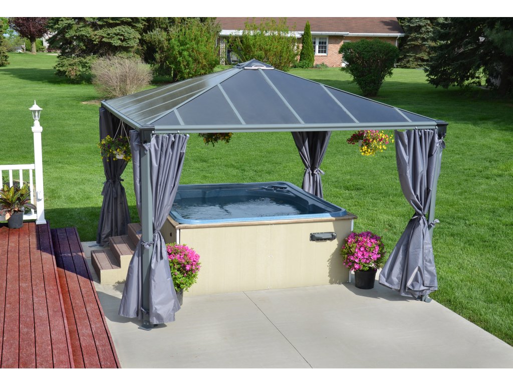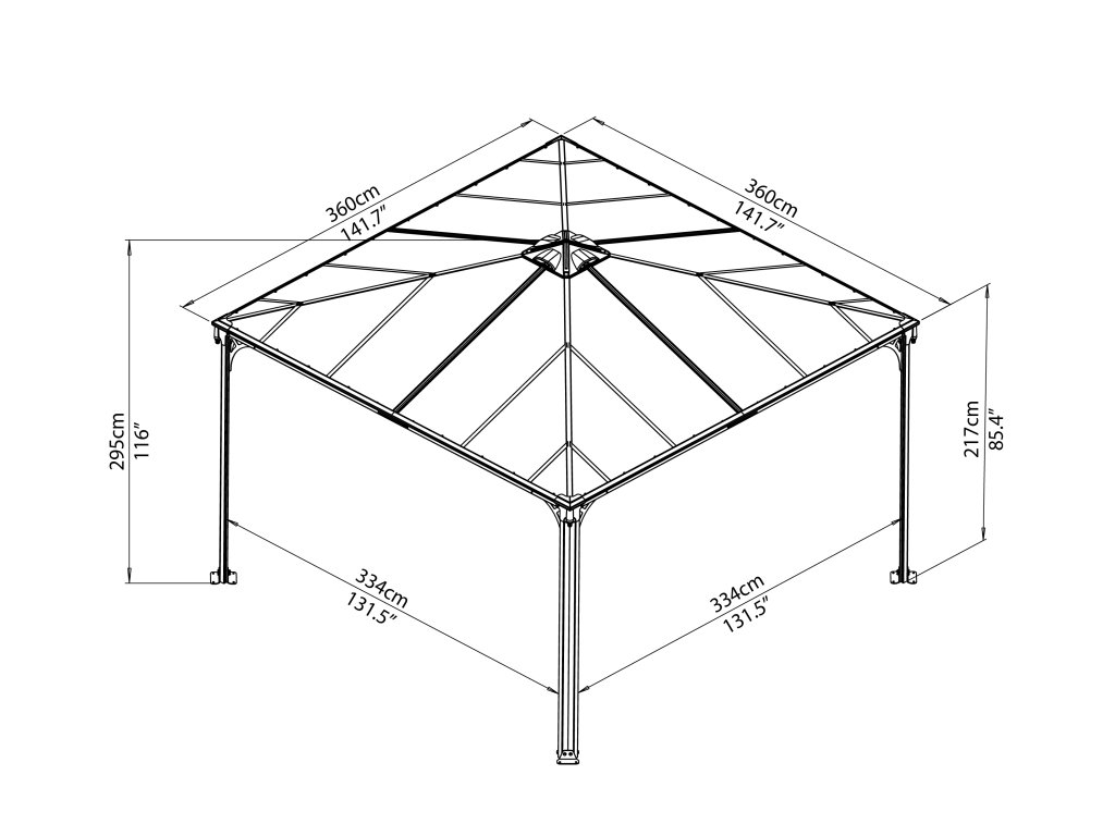 Palermo 3600 hliníkový altán od značky PALRAM Palermo je vhodný na krytie vonkajšieho posedenia, grilu alebo vonkajšej vírivky. Tieto altány majú robustnú konštrukciu a strechu zloženú zo 6 mm silných dvojkomorových polykarbonátových panelov, ktoré dokonale ochránia pred nepriaznivým počasím, vrátane dažďa, krúp, snehu a škodlivého UV žiarenia. Hliníková konštrukcia je v antracitovej farbe.