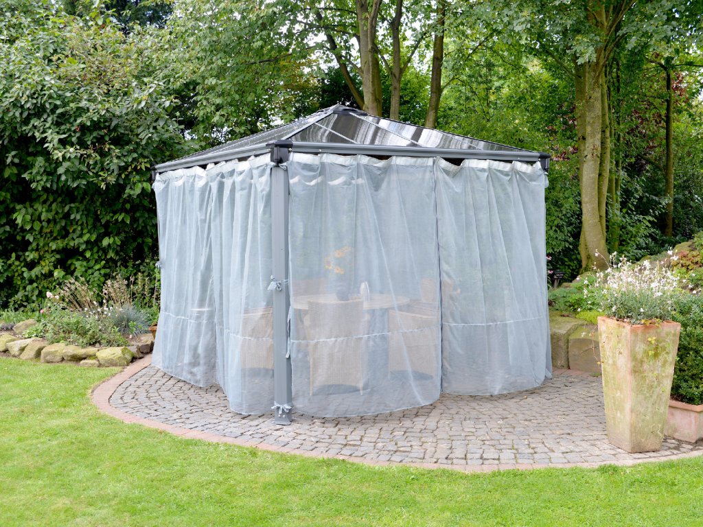 Integrovaný systém žľabov skvelo odvádza vodu. Integrovaný ventilačný otvor podporuje prúdenie vzduchu a odvádza dym pri grilovaní. Integrovaný systém posuvných háčikov na zavesenie závesu alebo siete proti hmyzu (možno dokúpiť ako príslušenstvo).