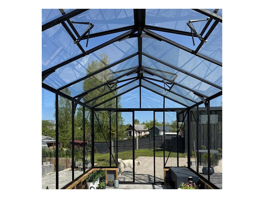 Skleník je vybaven manuálne otevíratelnými strešnými okny pre efektivní vetranie. Možno pridat automatické otevírače pre zajištení optimální teploty v prubehu dne. Integrované strešné ventilace zabezpečujú prirozený odvod tepla a vzduchu, což pomáhá regulovat vnútorné mikroklima a udržuje skleník v optimálních podmínkách pre rast rostlin. Možnosť pridání dalších ventilací pre zvýšení cirkulace vzduchu, ktorá je klíčová pre udržení správné teploty a vlhkosti.