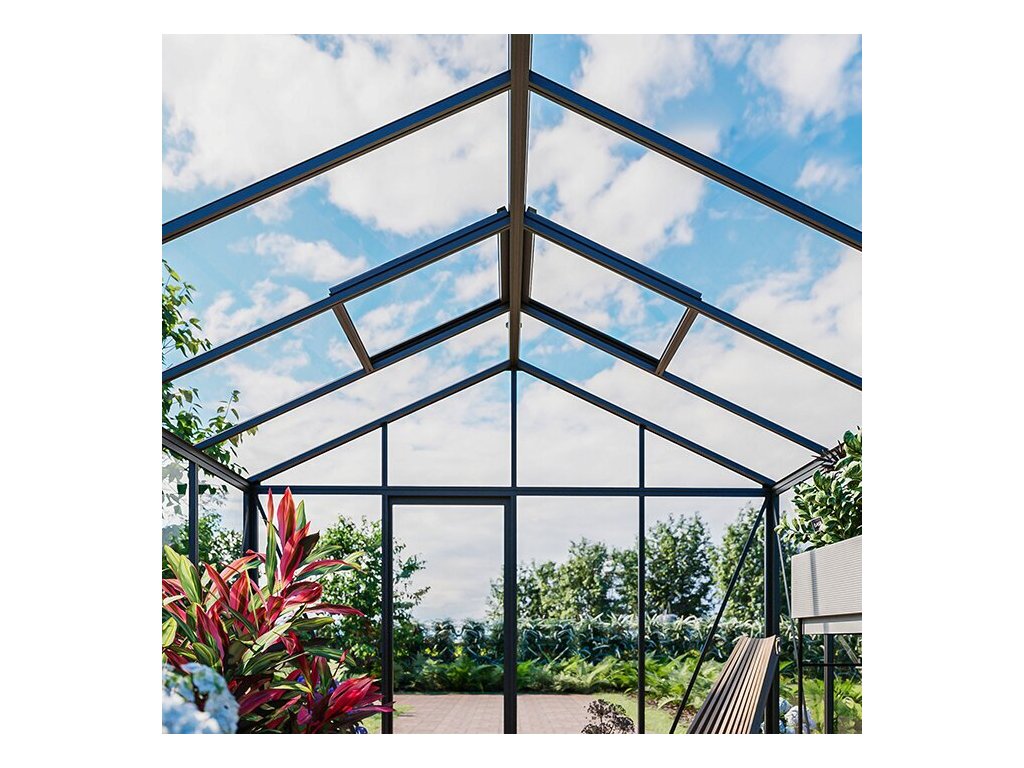 Součástí konštrukcie je integrovaný okapový systém pre efektivní odvod dešťové vody. Vďaka tomu sa voda nekumuluje na konštrukciu a skleník zustává čistý a funkční i pri pravidelných srážkách. Skleník je dodáván s integrovanou hliníkovou základnou, ktorá usnadňuje inštaláciu a prispívá k celkové stabilite prístenného riešenie.