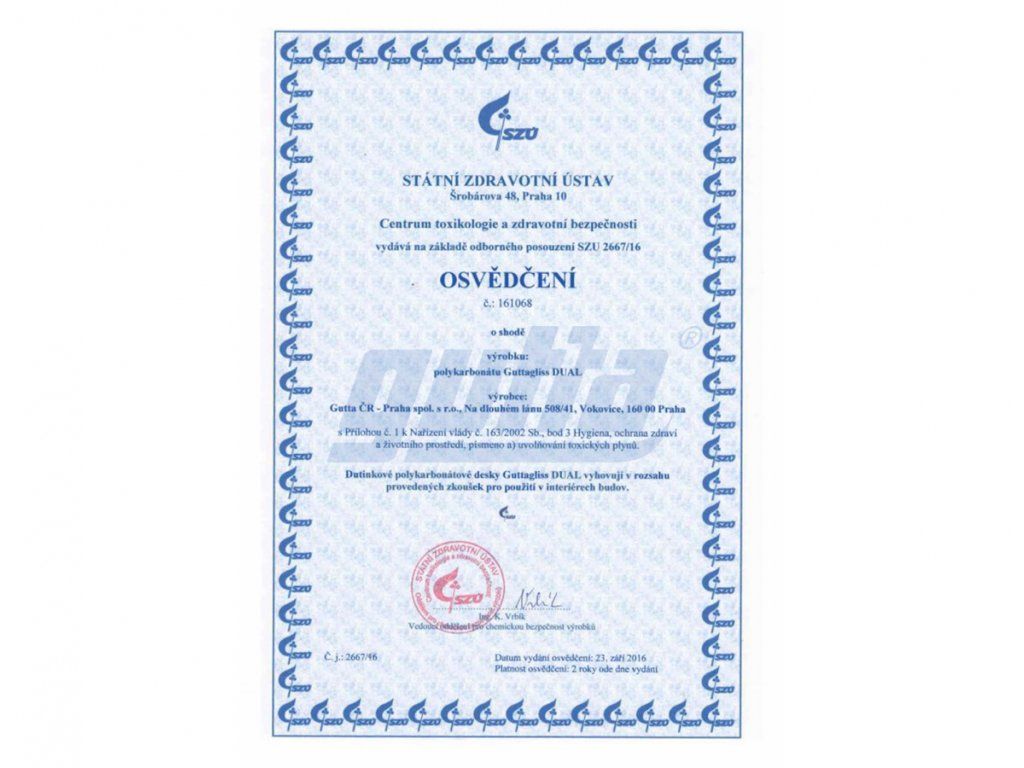 - Zdravotne nezávadný polykabonát Guttagliss s certifikátom SZÚ