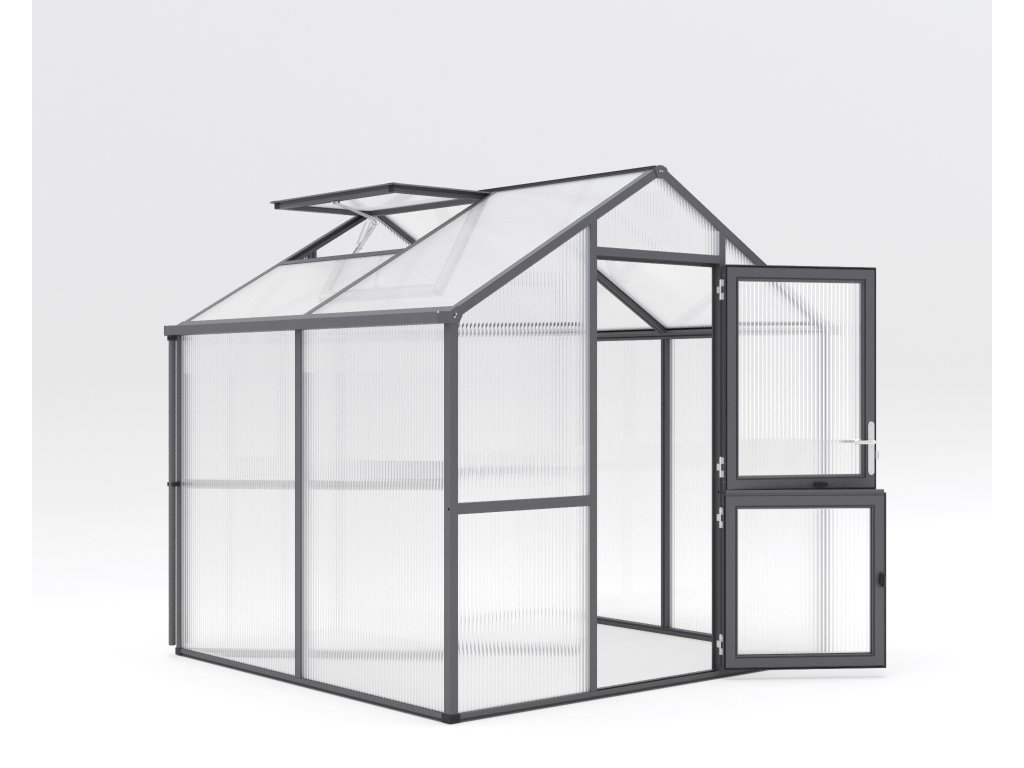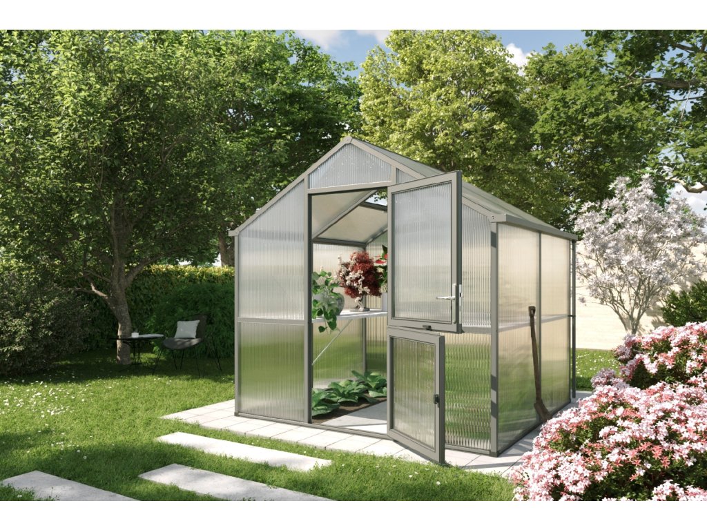 Skleník Iris je dostupný ve trech barevných variantách: prírodní hliník, jedlove zelená (RAL 6009) a antracitove šedá (DB 703). Vďaka tomu si môžete vybrat design, ktorý nejlépe zapadne do vaší zahrady.