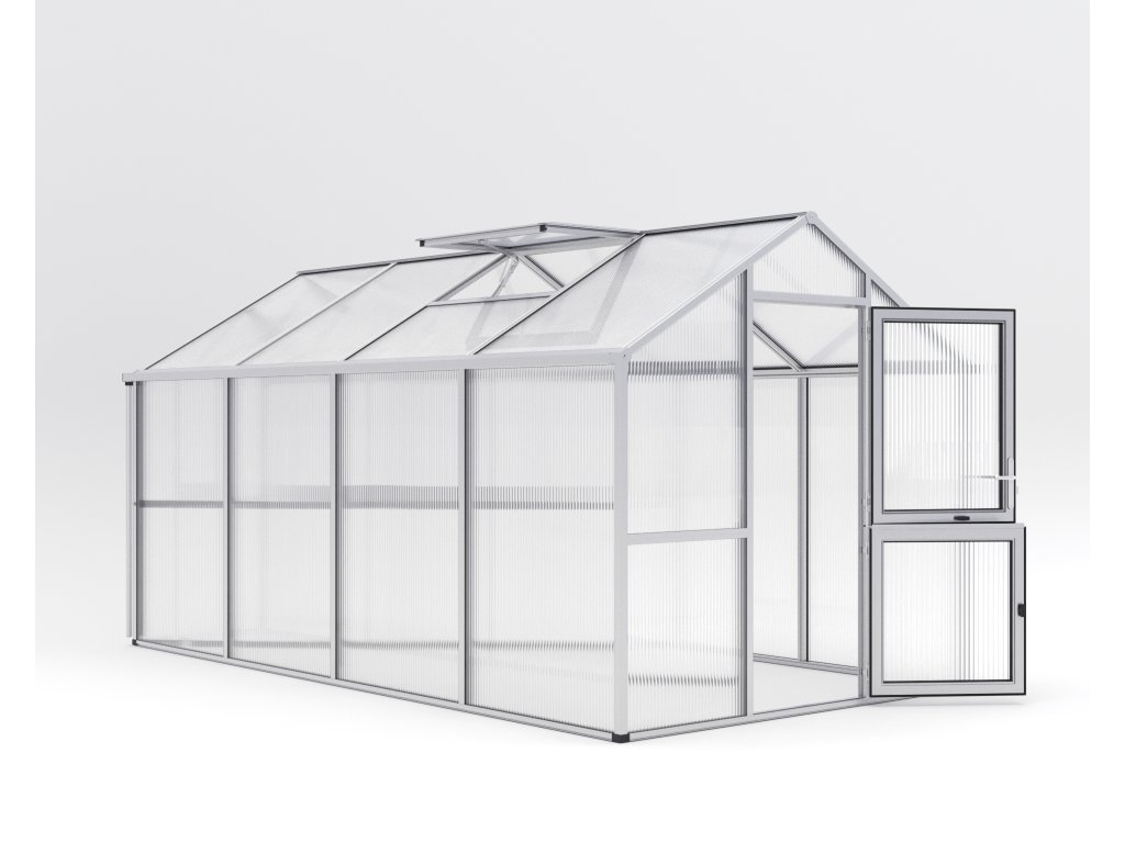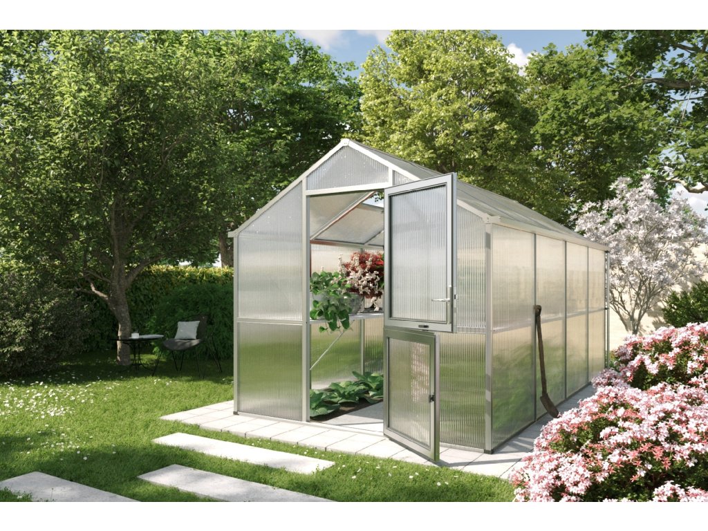 Pohodlná výška steny 1,60 m usnadňuje stání a prácu ve vzprímené poloze. To znamená, že rajčata a okurky môžu bez problému rast do výšky a plne sa rozvíjet. Robustní hliníková konštrukcie spolu s 16 mm komurkovými deskami ISO zabezpečujú optimální stabilitu. Praktické okapy s odtoky na obou stranách umožní svod dešťové vody do sudu.