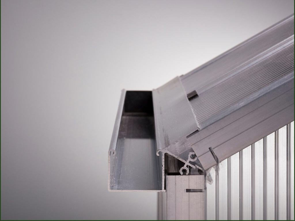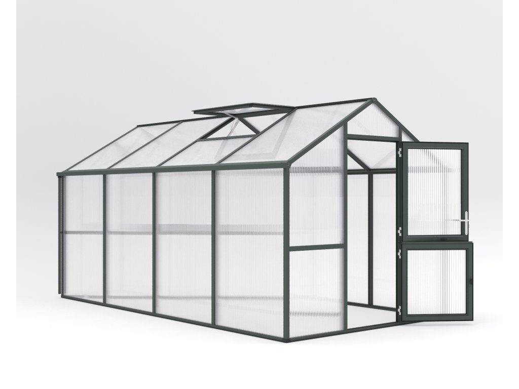 Pohodlná výška steny 1,60 m usnadňuje stání a prácu ve vzprímené poloze. To znamená, že rajčata a okurky môžu bez problému rast do výšky a plne sa rozvíjet. Robustní hliníková konštrukcie spolu s 16 mm komurkovými deskami ISO zabezpečujú optimální stabilitu. Praktické okapy s odtoky na obou stranách umožní svod dešťové vody do sudu.