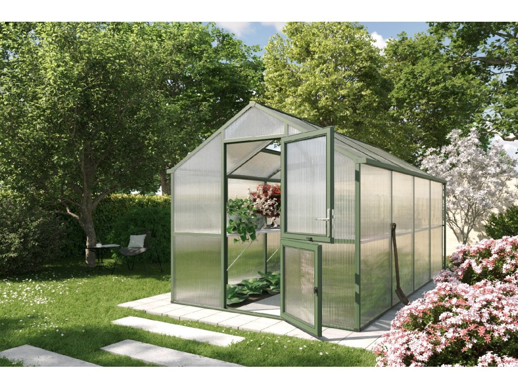 Skleník Iris je dostupný ve trech barevných variantách: prírodní hliník, jedlove zelená (RAL 6009) a antracitove šedá (DB 703). Vďaka tomu si môžete vybrat design, ktorý nejlépe zapadne do vaší zahrady.