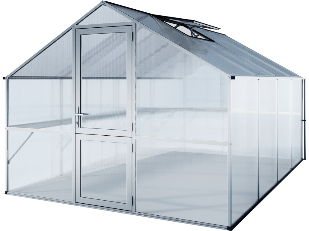 S výškou steny 1,49 m a velkorysou výškou hrebeňa 2,15 m je zde dostatek prostoru pre prácu i pre vyšší kultury – rajčata a okurky môžu bez potíží rast vzhuru a plne sa rozvíjet. Skleník je vybaven širokými delenými otočnými dverami a oknem v zadní stene s ručním otevíráním. O automatickou cirkulaci vzduchu sa stará strešné okno s automatickým otvíračem. Pre zabezpečení je standardne dodávána uzamykatelná sada pákových klik Hoppe a jedinečný vzhled dverí podtrhují hladce fungující vnútorné panty. Na obou stranách sú okapy s odpadními trubkami (dĺžka 1,40 m) pre svod dešťové vody.