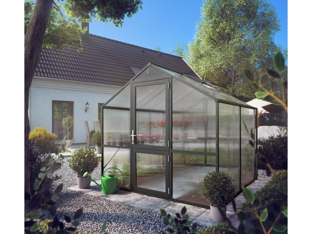 Hliníkový skleník KGT Rose II antracit byl špeciálne vyvinut pre náročné hobby zahradníky. Pruhledné dvojité steny ISO o tloušťce 10 mm sú po celém obvodu zcela uzavreny v profilech, takže sa desky ani pri neprízni počasí nemohou uvolnit. K upevnenie nie sú použity žádné sponky ani drobné príchytky – zasklení výrazne zvyšuje stabilitu celé konštrukcie. Dvojité steny nepropouštejí UV zárení, a proto stínení obvykle nie je nutné; zároveň mají vysokou izolační hodnotu, takže sa teplo udrží ve skleníku déle.