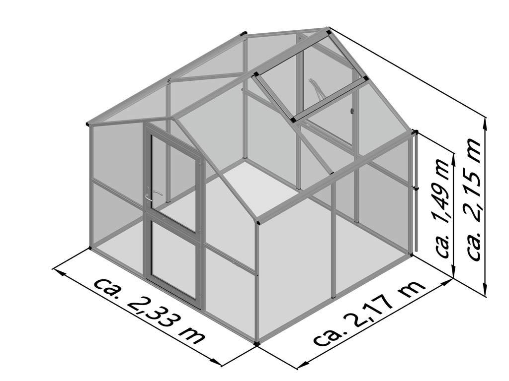 S výškou steny 1,49 m a velkorysou výškou hrebeňa 2,15 m je ve skleníku dost prostoru pre vás i vaše rostliny. Rajčata a okurky môžu bez problému rast vzhuru a plne sa rozvíjet. Skleník Rose je vybaven delenými otočnými dverami a oknem v zadní stene s ručním otevíráním; o komfortní prívod čerstvého vzduchu sa stará strešné okno s automatickým otvíráním. O bezpečí sa postará uzamykatelná sada pákových klik Hoppe a hladce fungující vnútorné dverové panty. Standardem sú tiež okapy s odtokovými trubkami na obou stranách (dĺžka 1,40 m).