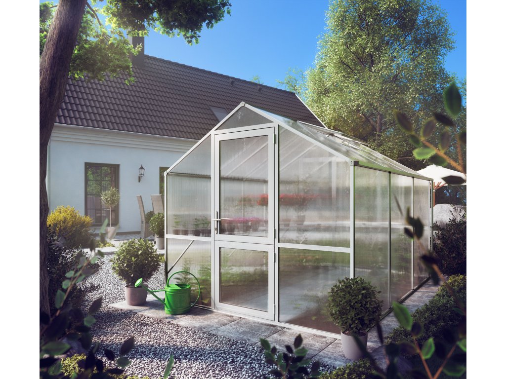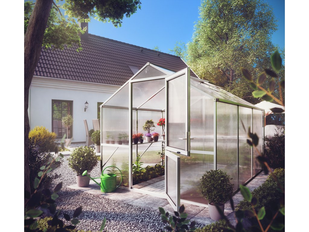 Hliníkový skleník KGT Rose III šedá farba byl špeciálne vyvinut pre náročné hobby zahradníky. Pruhledné dvojité steny ISO o tloušťce 10 mm sú po celém obvodu zcela uzavreny v profilech, takže sa desky ani pri neprízni počasí nemohou uvolnit. K upevnenie nie sú použity žádné sponky ani drobné príchytky – zasklení výrazne zvyšuje stabilitu celé konštrukcie. Dvojité steny nepropouštejí UV zárení, a proto stínení obvykle nie je nutné; zároveň mají vysokou izolační hodnotu, takže sa teplo udrží ve skleníku déle.